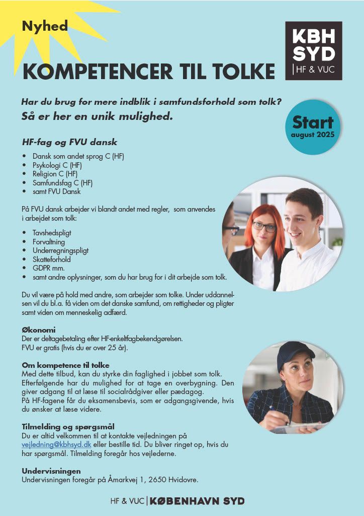 Er du tolk, og vil du gerne udvikle dine faglige kompetencer? Fra august 2025 kan du tage en række HF-fag samt FVU Dansk, som giver dig en stærkere forståelse af både tolkeetik og det danske samfund.