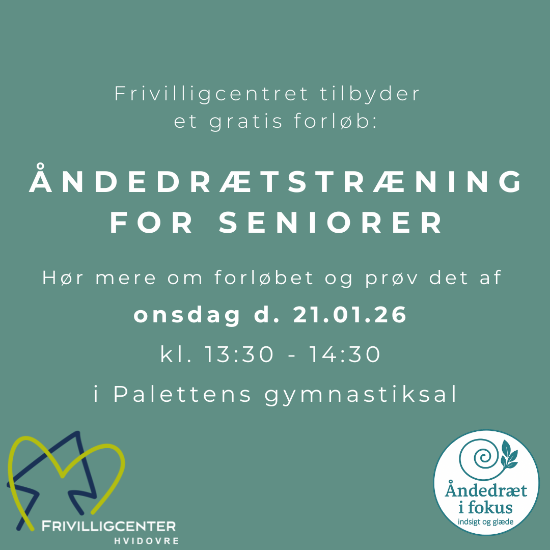 Frivilligcenter Hvidovre tilbyder endnu et gratis forløb i åndedrætsteknikker i samarbejde med Åndedræt i Fokus. Denne gang er forløbet særligt målrettet dig, der er 65+ år.